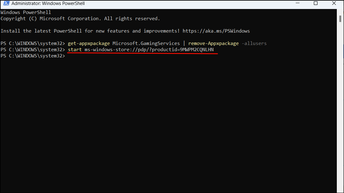 Step 3: After the command executes, run the following command to reinstall the gaming services: