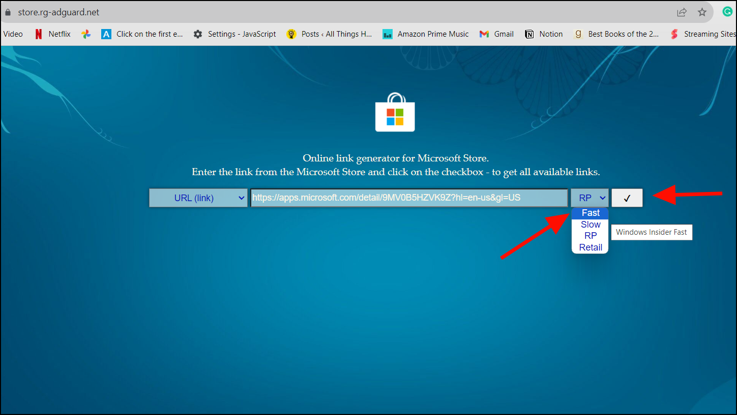 Step 3: Go to Store.rg-adguard.net. Paste the copied URL into the search bar, select URL from the dropdown menu, and click the checkmark button.