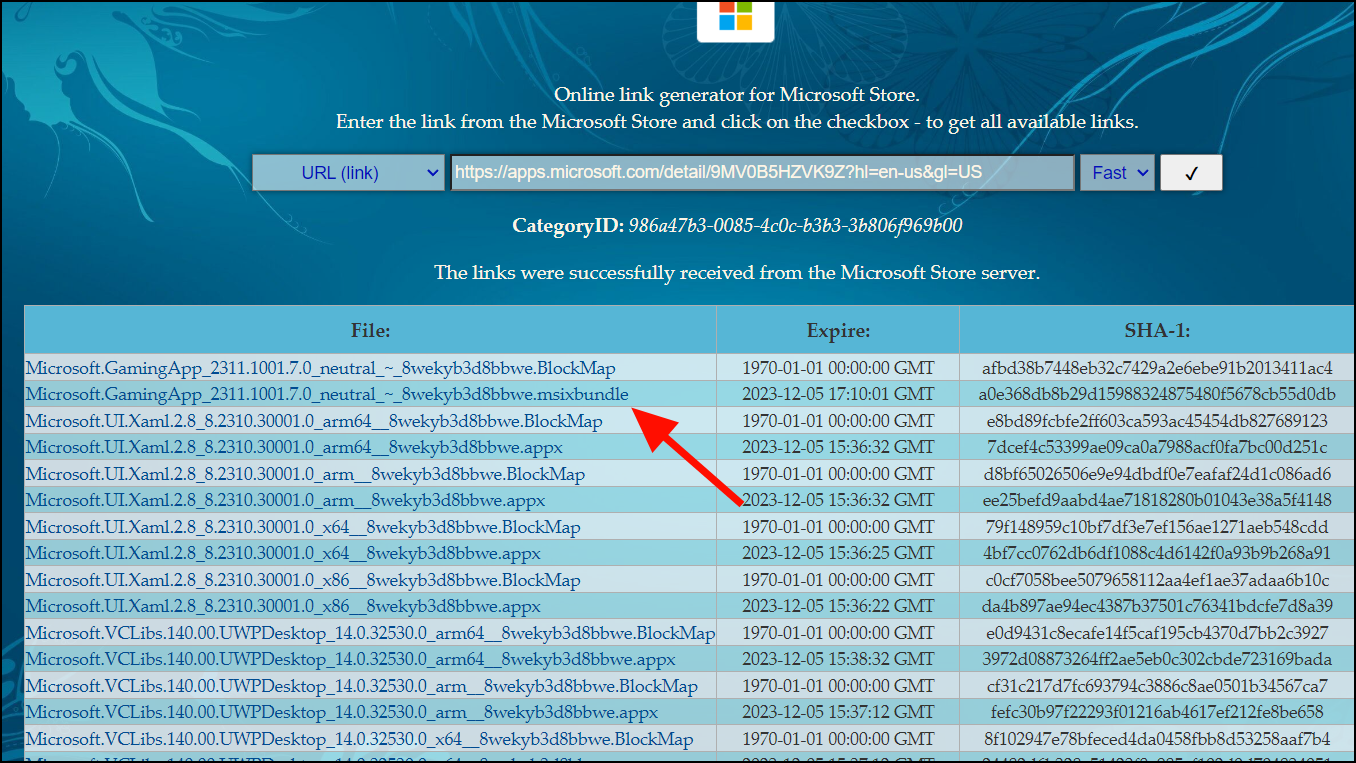Step 4: Scroll down to find the latest version of the app, listed as Microsoft.GamingApp. Click the link ending with .msixbundle to download it.