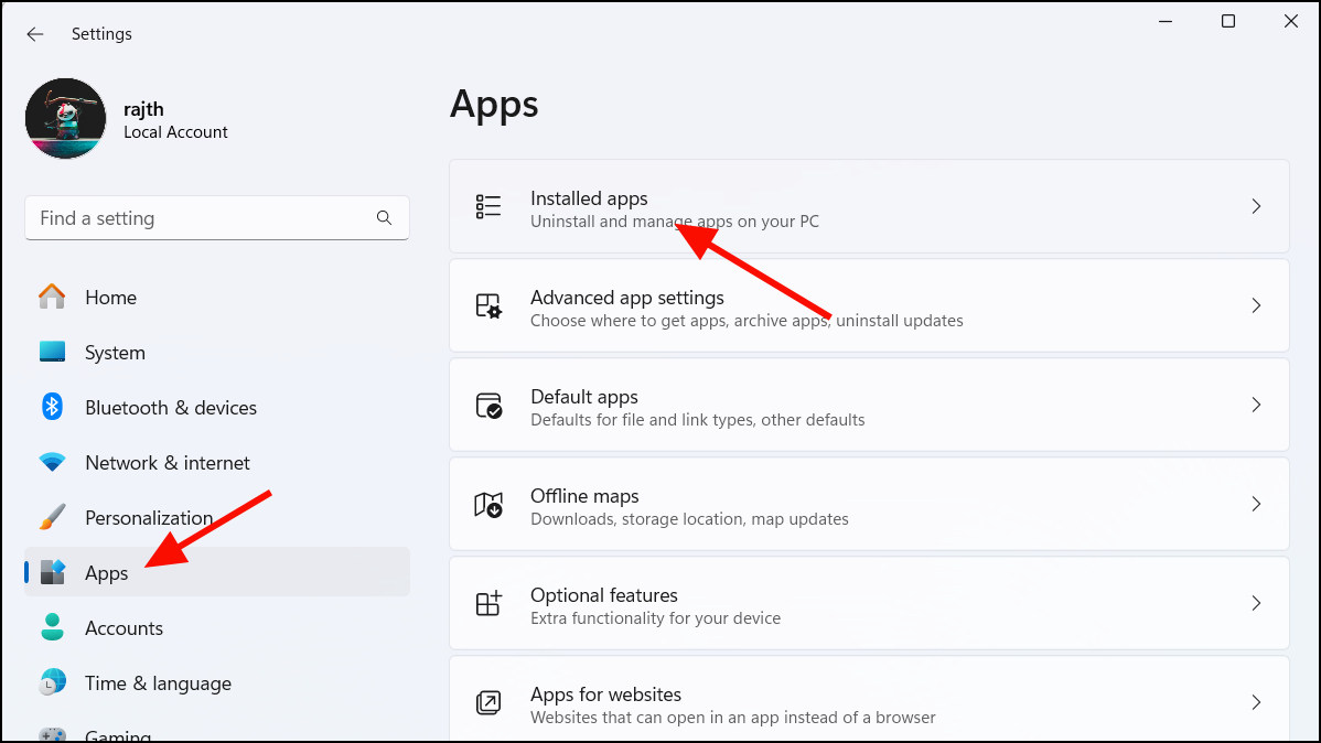 Step 1: Open the Windows Settings app by pressing Windows + I. Navigate to Apps in the left pane, then select Installed apps.