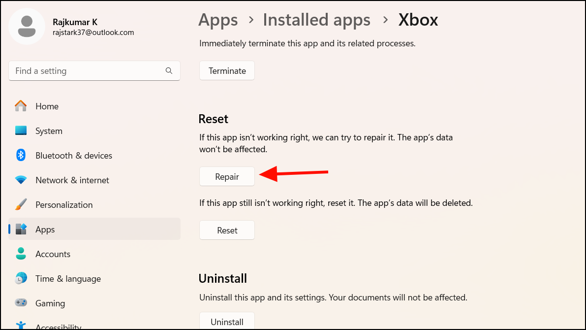 If repairing and resetting didn't fix the problem, reinstalling the Xbox app can help by rebuilding its files from scratch.