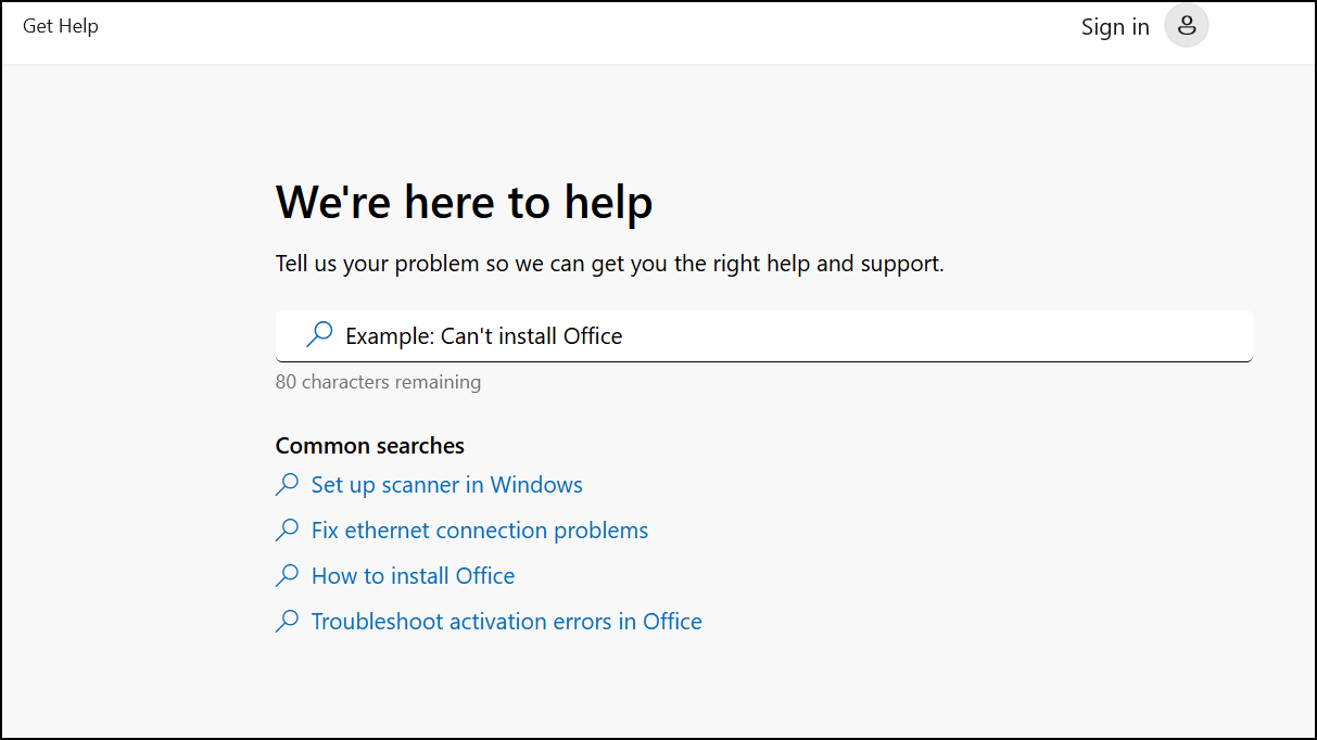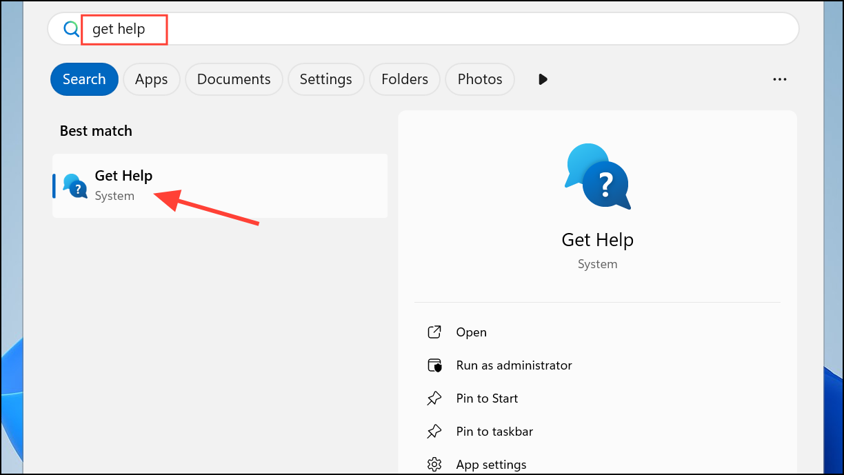 Step 1: Open the Get Help app by selecting Start, typing Get Help, and pressing Enter. In the app, search for “printer troubleshooter.”