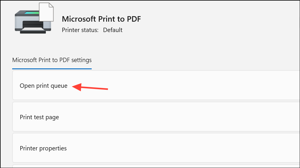 Step 3: Select your printer, then click Open print queue. If previous print jobs are stuck, select the ellipsis (...) and click Cancel all. Clearing the queue removes blocked tasks that may prevent new jobs from processing.
