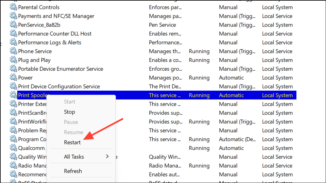 Step 2: Locate Print Spooler in the list. Right-click it and select Restart. Restarting this service clears communication issues between Windows and the printer, especially when print jobs remain stuck or the print queue fails to update.