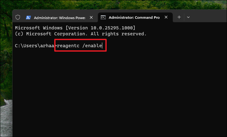 Step 7: In the Command Prompt, type or copy and paste the following command and press Enter to re-enable WinRE:
