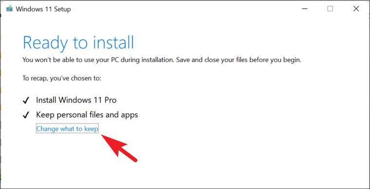 Step 7: Click on Change what to keep to choose your installation preferences.