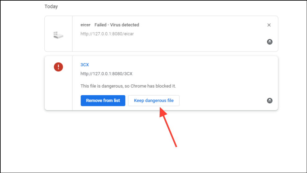 Step 3: Try downloading your EXE file again. Chrome should now show a warning with an option to keep the file, rather than blocking it completely.