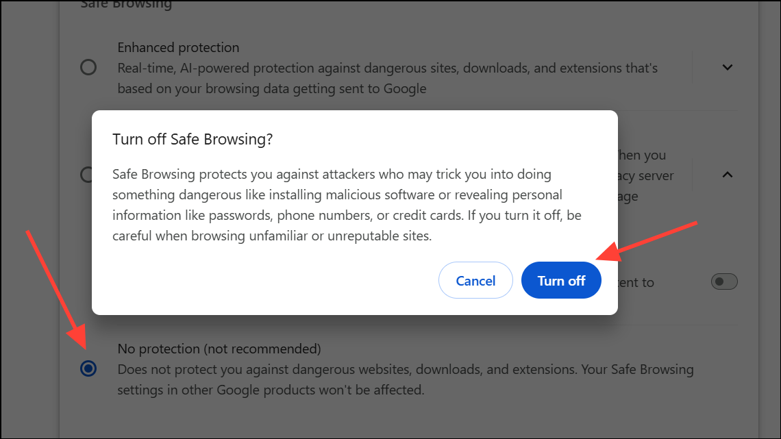 Step 3: Under “Safe Browsing,” select No protection (not recommended). Chrome will warn you about the risks—acknowledge the warning to proceed.