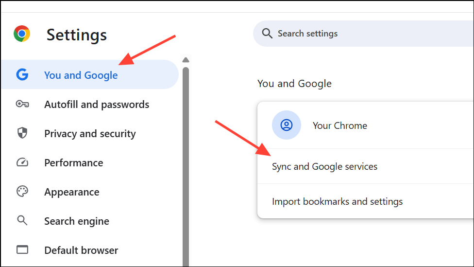 Step 1: Open Chrome’s Settings and navigate to You and Google > Sync and Google services.