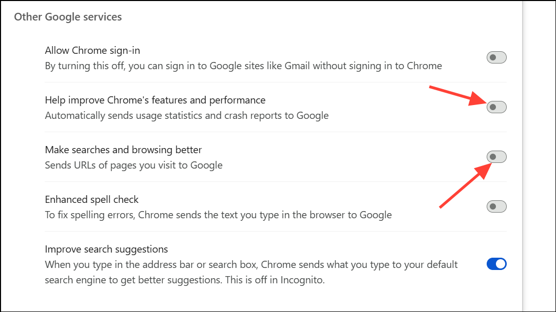 Step 2: Toggle off options such as Help improve Chrome’s features and performance and Make searches and browsing better. These settings may affect Chrome’s download behavior by limiting data sent to Google for analysis.