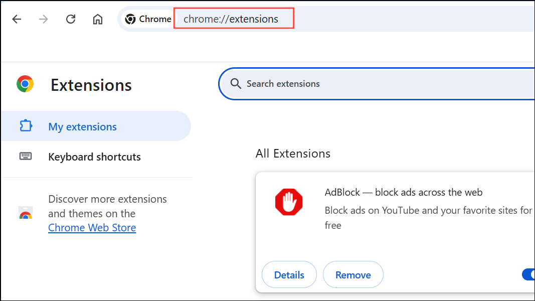 Step 1: Open Chrome and enter chrome://extensions in the address bar. This brings up the Extensions management page where you can see all installed extensions and their status.