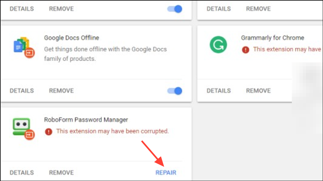 Step 2: Locate the extension marked as "corrupt." You will see a warning and a Repair button next to it. Click the Repair button. Chrome will automatically download a fresh copy of the extension from the Chrome Web Store and reinstall it, replacing any damaged files.