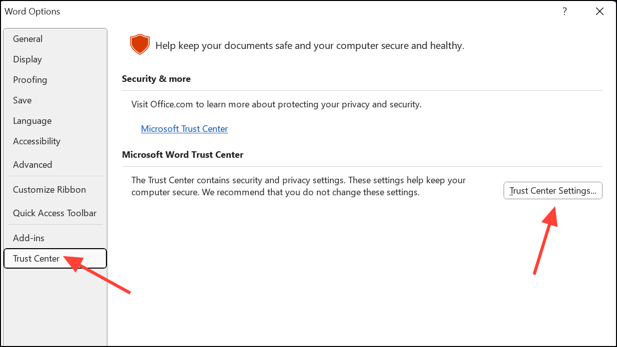 Step 3: In the Word Options window, select Trust Center from the left sidebar. Then, click the Trust Center Settings button on the right.