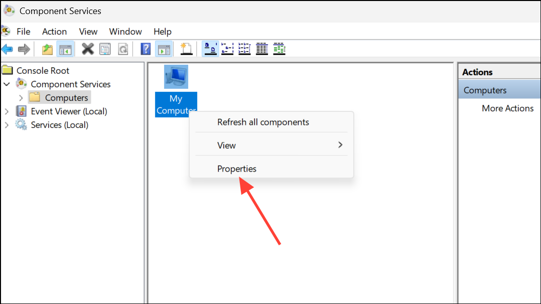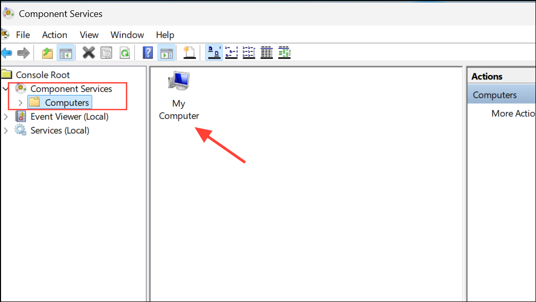 Step 3: In the left panel, expand Component Services > Computers, then select My Computer.
