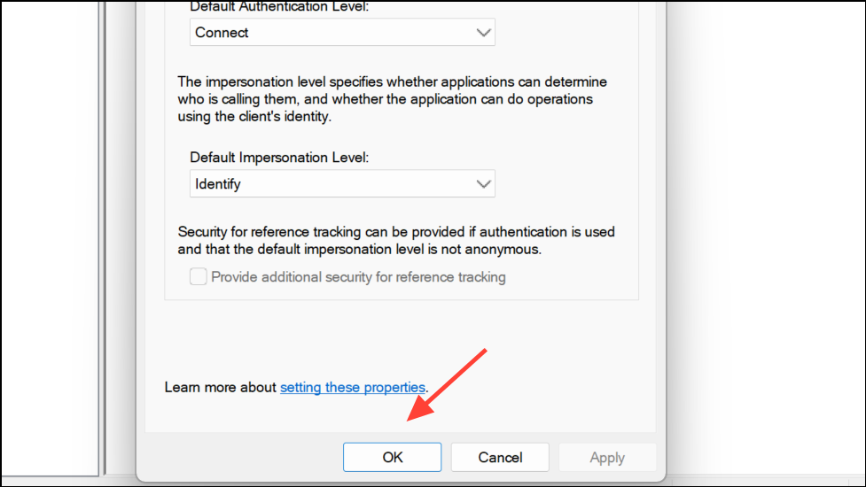 Step 5: Go to the Default Properties tab. Set Default Authentication Level to Connect and Default Impersonation Level to Identify.