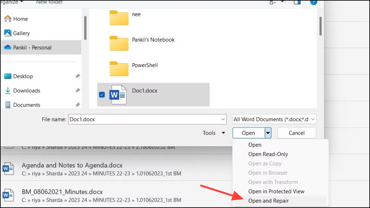 If the repair is only partially successful or if some content is missing, try the “Recover Text from Any File” option in the Open dialog’s file type dropdown. This may extract text, although formatting and images may be lost.