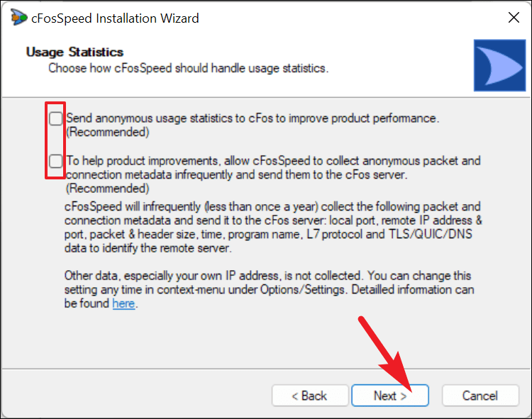 Usage Statisticsscreen, decide whether to share data by checking the relevant boxes. Then, clickNextto initiate the installation.