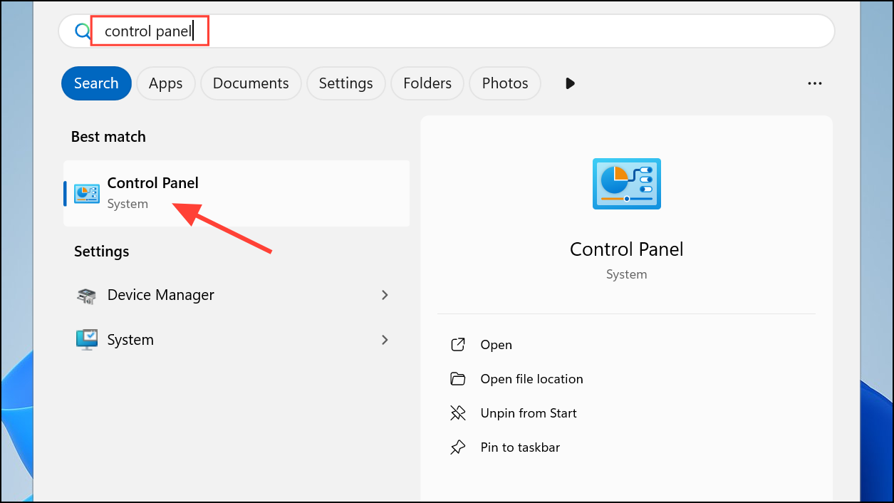 Step 1: Open the Windows 11 Start menu and type control panel. Launch the Control Panel application.