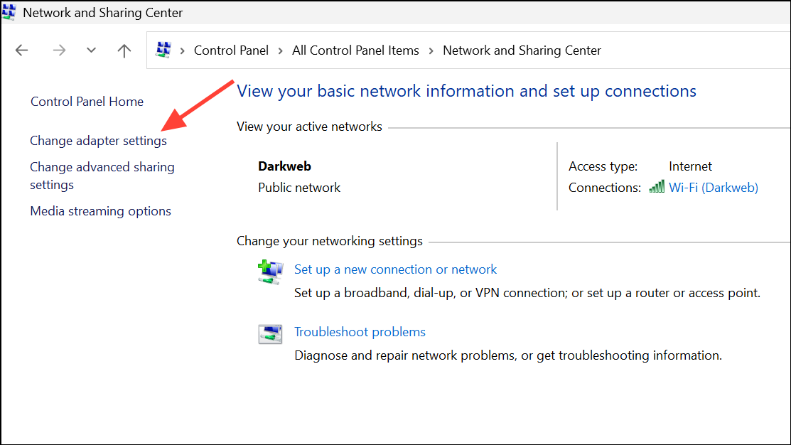 Step 2: Navigate to Network and Internet → Network and Sharing Center. Click Change adapter settings in the left sidebar.