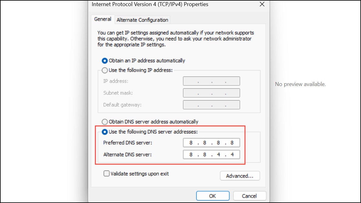 Step 4: Select Use the following DNS server addresses. Enter 8.8.8.8 as the Preferred DNS server and 8.8.4.4 as the Alternate DNS server for Google DNS. For Cloudflare DNS, use 1.1.1.1 and 1.0.0.1.