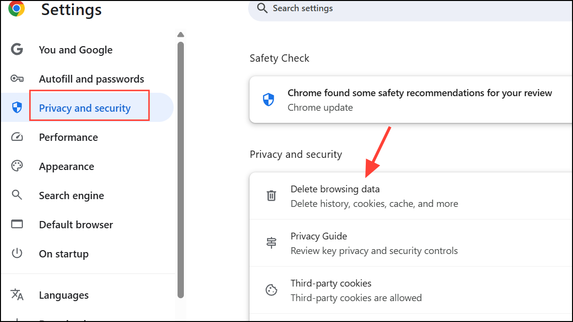 Step 1: Open Chrome and click the three-dot menu in the top-right corner. Choose Settings → Privacy and security → Delete browsing data.