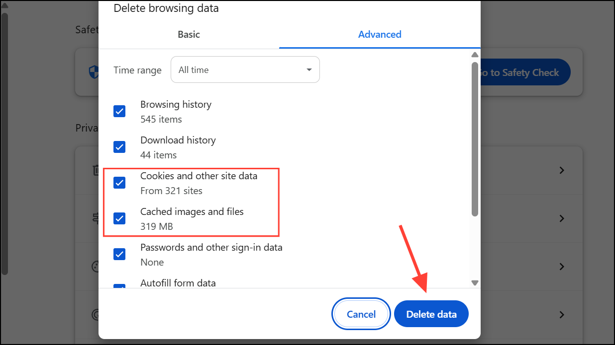 Step 2: Select Cookies and other site data and Cached images and files. Set the time range to All time for a complete reset.