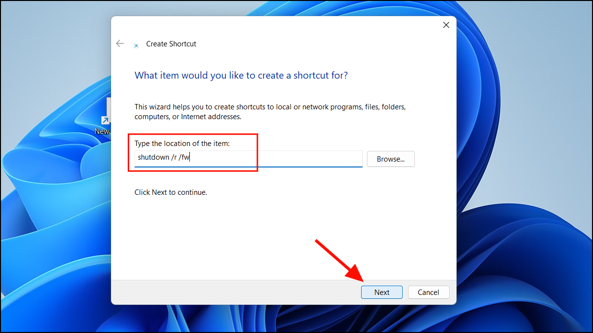 Step 2: In the 'Create Shortcut' window, enter shutdown /r /fw in the 'Type the location of the item' field and click 'Next'.