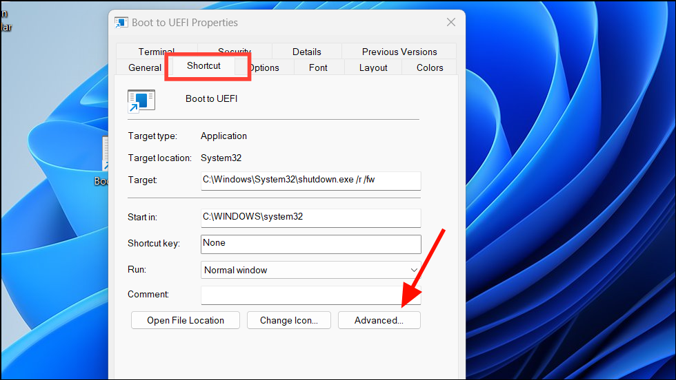 Step 5: In the 'Shortcut' tab, click on the 'Advanced' button.