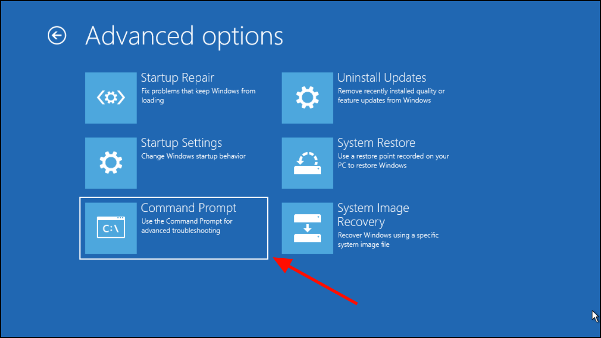 Step 5: In the recovery environment, select 'Troubleshoot', then 'Advanced options', and click on 'Command Prompt'.