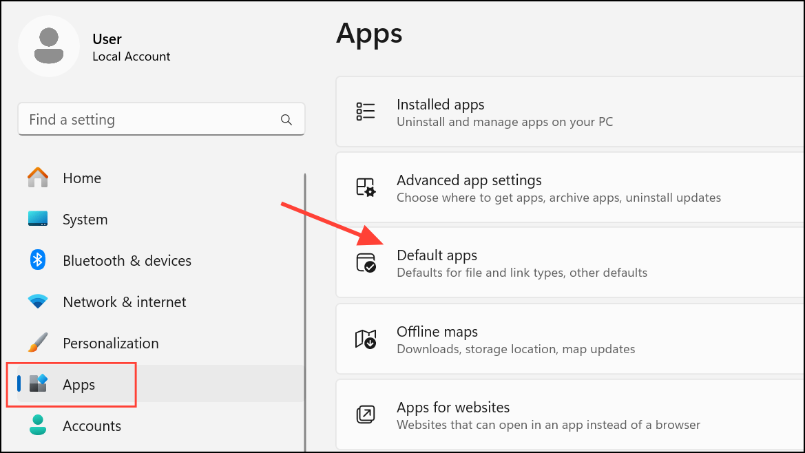 Step 2: In the Settings window, click Apps, then select Default Apps. This section lets you assign default programs for specific file types and protocols.