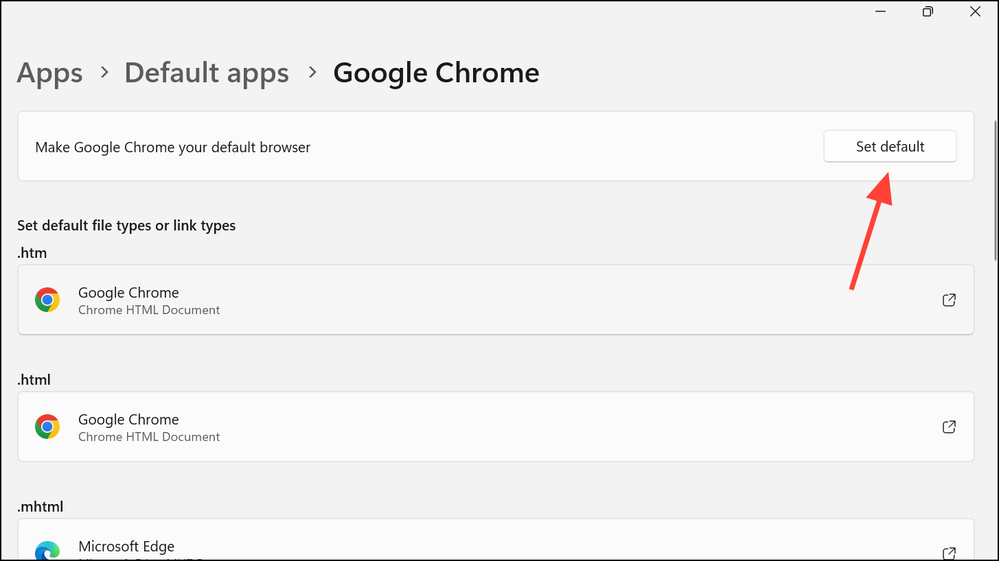 Step 5: Review the list of file types and link types (such as .htm, .html, HTTP, and HTTPS) below the "Set default" button. If any still show Microsoft Edge or another browser, click each and select Google Chrome from the list. This step ensures Chrome handles all relevant web protocols and file types.