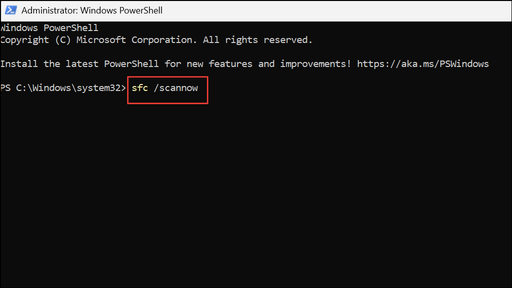 Step 2: In the PowerShell window, type SFC /Scannow and press Enter. This command scans and repairs corrupted system files that could interfere with default app settings.
