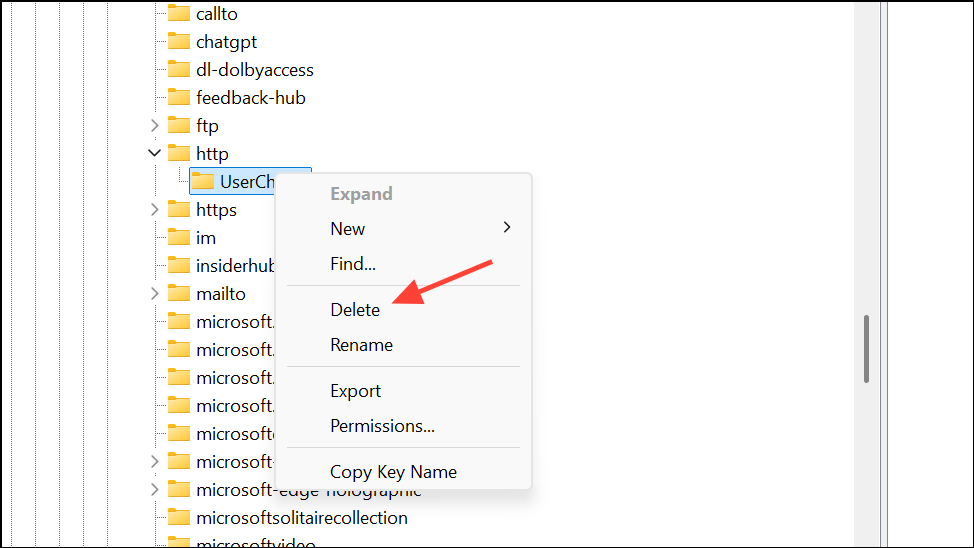 Step 3: Right-click the UserChoice subkey in each location and select Delete. This removes the forced association and allows Windows to accept your new default browser choice.