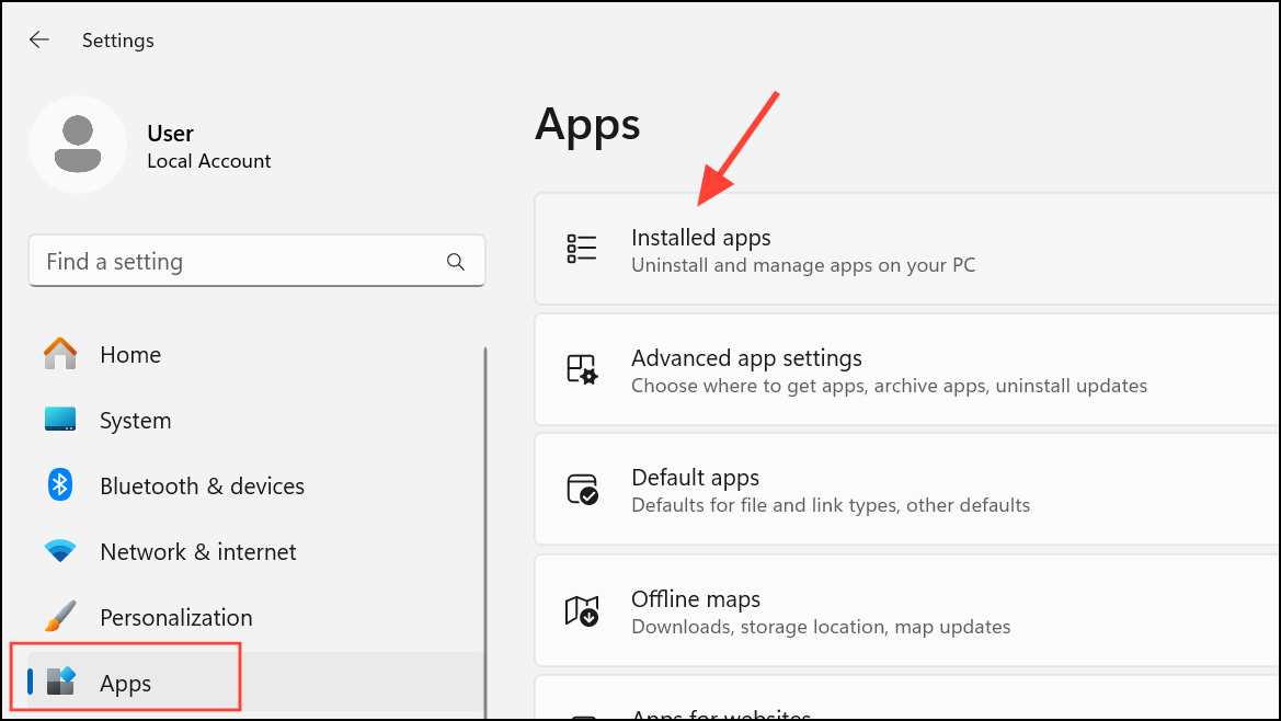 Step 1: Remove the existing OneDrive installation. Go to Settings > Apps > Installed Apps.