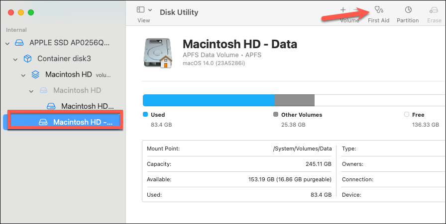 Step 4: Starting with the last volume on your startup disk, select it and click 'First Aid' in the toolbar.