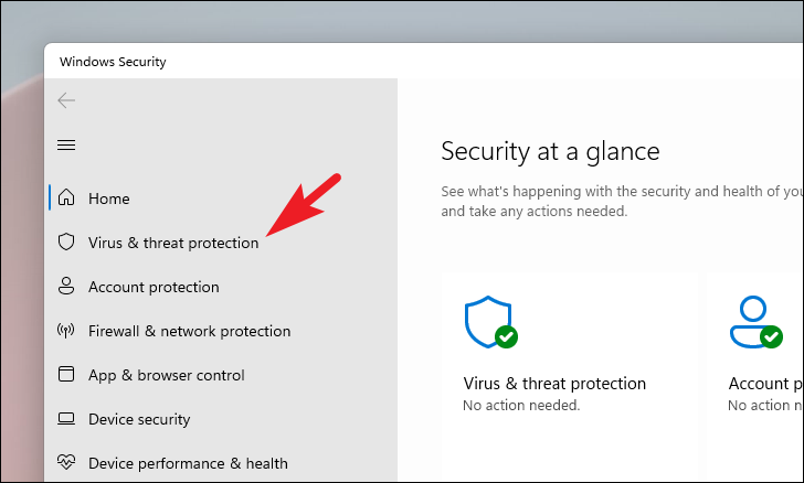 Step 2: In the Windows Security window, click on 'Virus & threat protection' in the left sidebar.