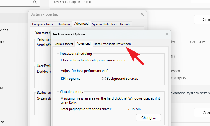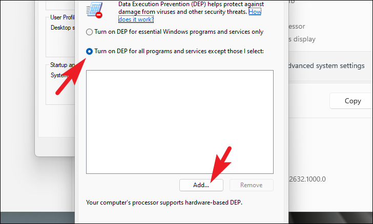 Step 5: Go to the 'Data Execution Prevention' tab. Select 'Turn on DEP for all programs and services except those I select'.