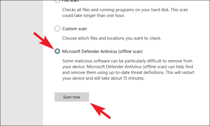 Step 4: Select 'Microsoft Defender Antivirus (offline scan)' and click 'Scan now'.