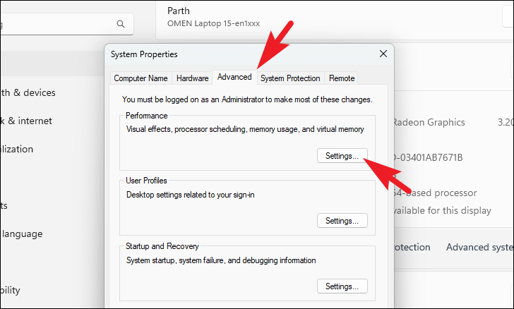 Step 4: Under the 'Advanced' tab, click on 'Settings' in the 'Performance' section.