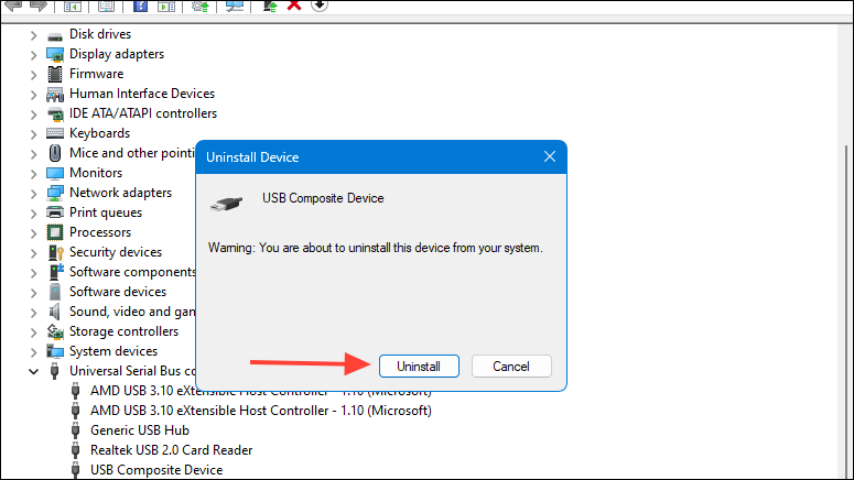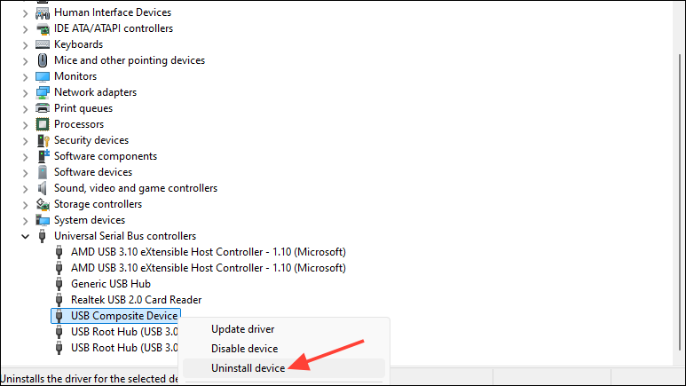 - Right-click on each entry labeled USB Composite Device, Generic USB Hub, or USB Root Hub and select Uninstall device.