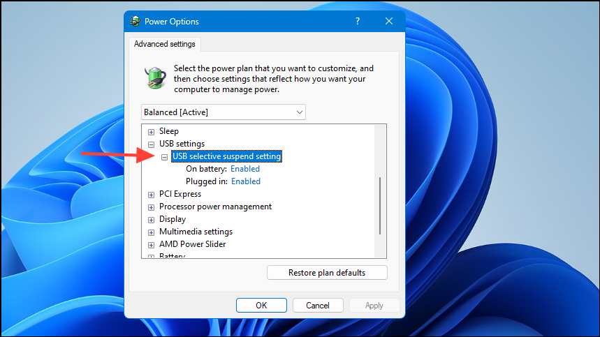 Disabling the USB selective suspend setting can prevent the system from turning off USB devices to save power.