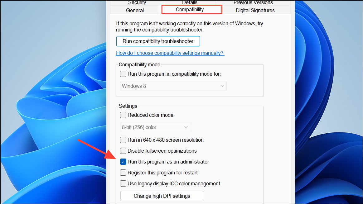 Step 2: If this step works and you want to automate it, right-click the shortcut again, choose Properties, go to the Compatibility tab, and check Run this program as an administrator. Click Apply and OK to save the setting.
