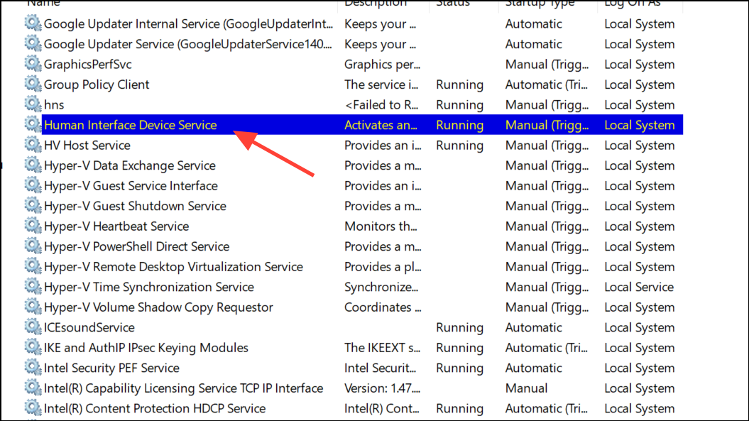 Step 2: Scroll down and locate Human Interface Device Service. This service manages input from devices like keyboards, mice, and media buttons that might send unintended play/pause signals.