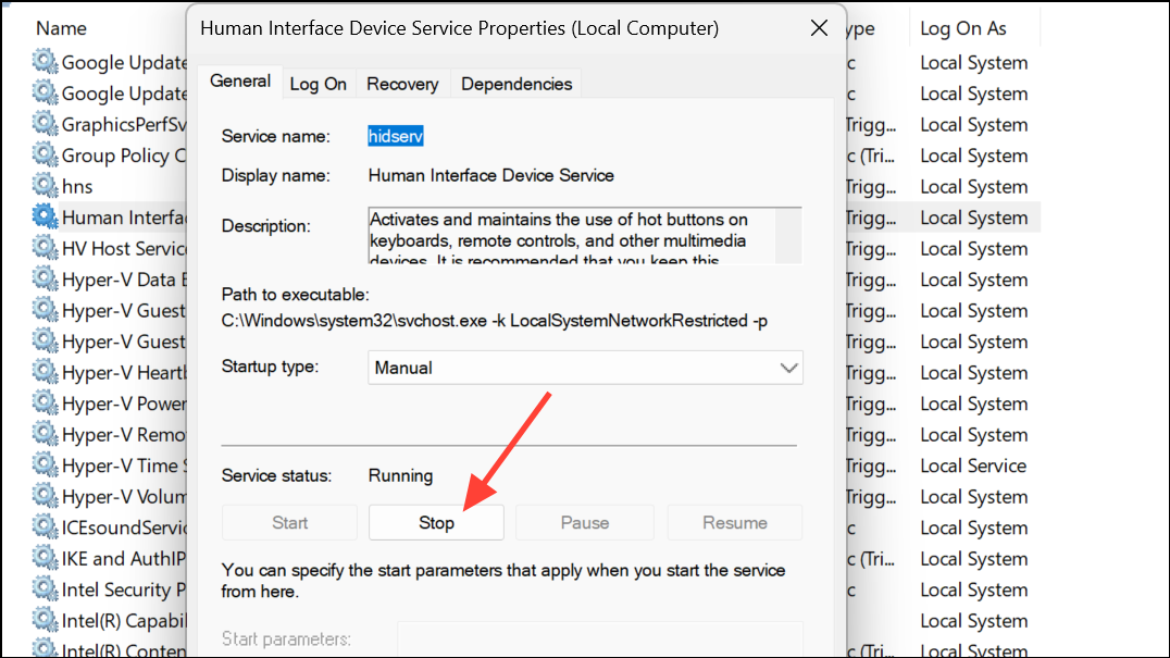Step 3: Double-click the service to open its properties. Click Stop, then select Apply. This halts the service, which can resolve issues caused by malfunctioning input devices repeatedly sending play/pause commands.