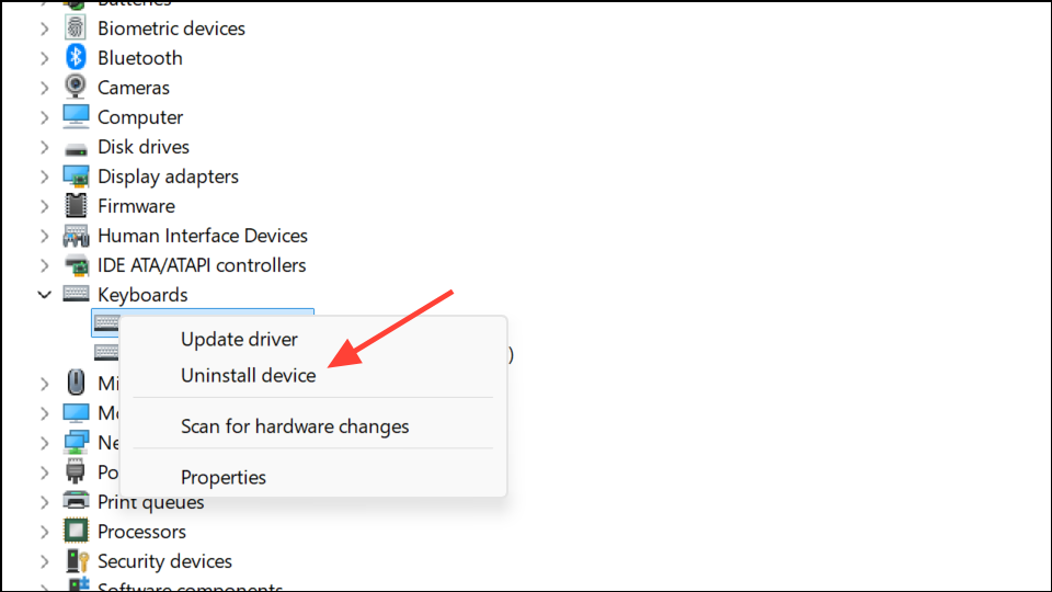 Step 2: Expand the categories for Keyboards, Mice and other pointing devices, and Human Interface Devices. Right-click on any devices you suspect may be causing issues (such as those related to external peripherals or unfamiliar device names) and choose Uninstall device. Confirm the uninstallation if prompted.