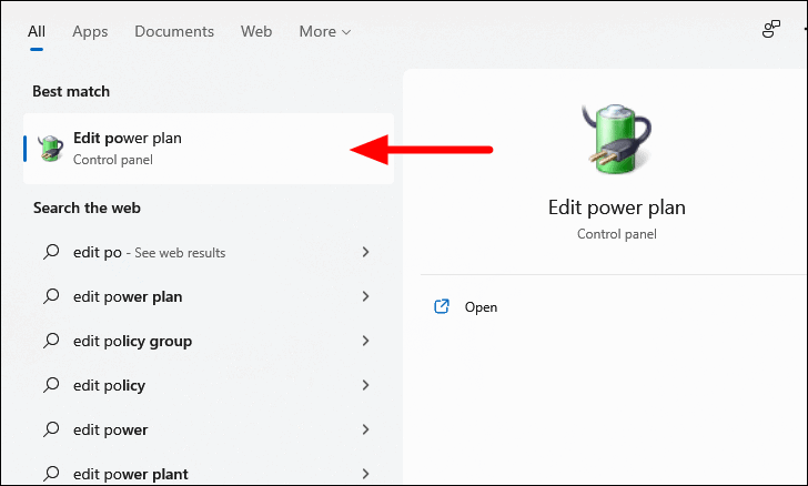 WINDOWS+Sto open the search bar. Type Edit power plan and select it.