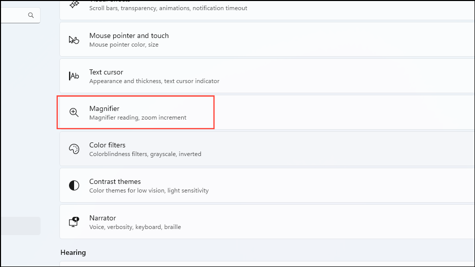 Another reason your screen can appear zoomed in is if you've turned on the Magnifier app by accident. You can turn it off by using the Win + Esc shortcut. After turning it off, follow these steps to ensure it does not turn on automatically again.