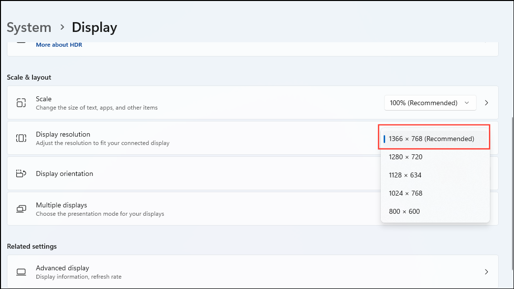 - Now go back and click on the dropdown menu for the Display resolution and select a recommended option.