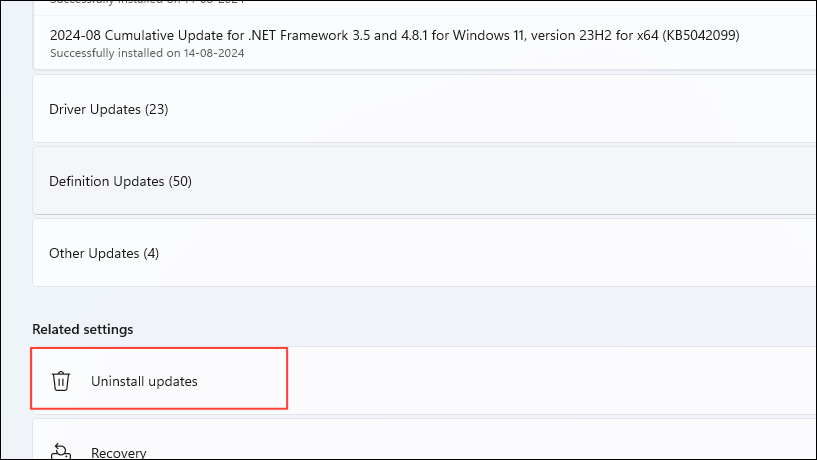 - On the Update History page, scroll down and click on 'Uninstall updates'.