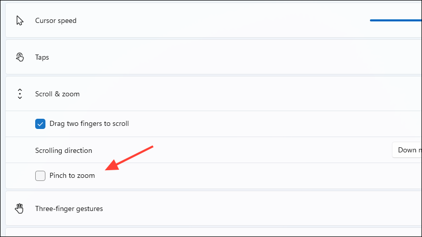 - Finally, click on the checkbox for the 'Pinch to zoom' option to disable it.